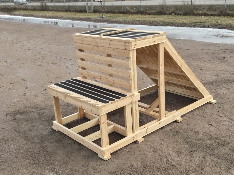 Spännande hinder där man först drar sig upp för den lutande snedväggen med hjälp av att fatta repet och med fotnedsättning jobba sig upp till den övre platån, för att sedan släppa repet och ta sig till den nedre avsatsen och därefter till marken.
