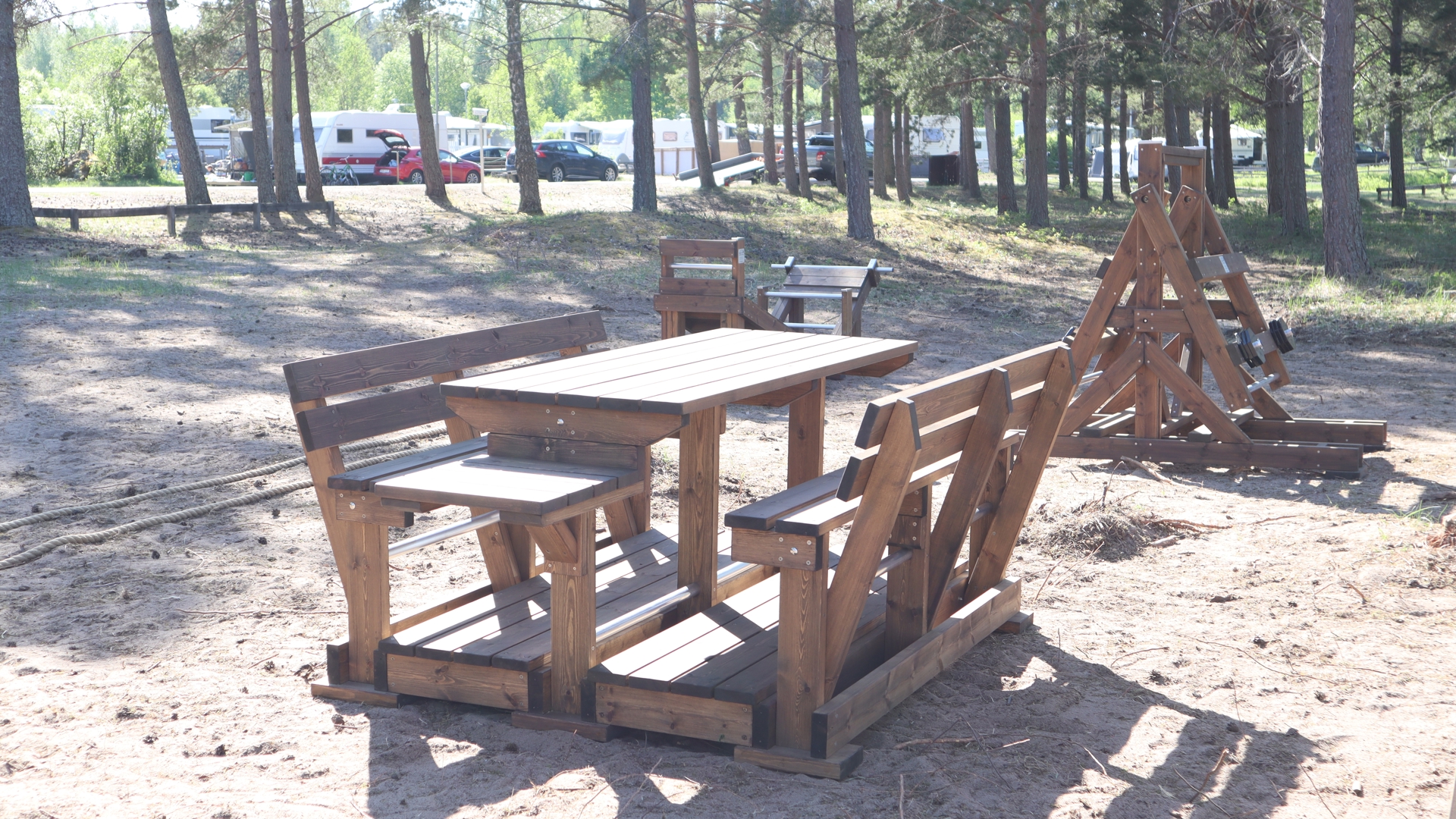Detta bänkbord är en helt fristående robust konstruktion tillverkad i Gotländsk kärnfuru (Svensk FSC-furu).